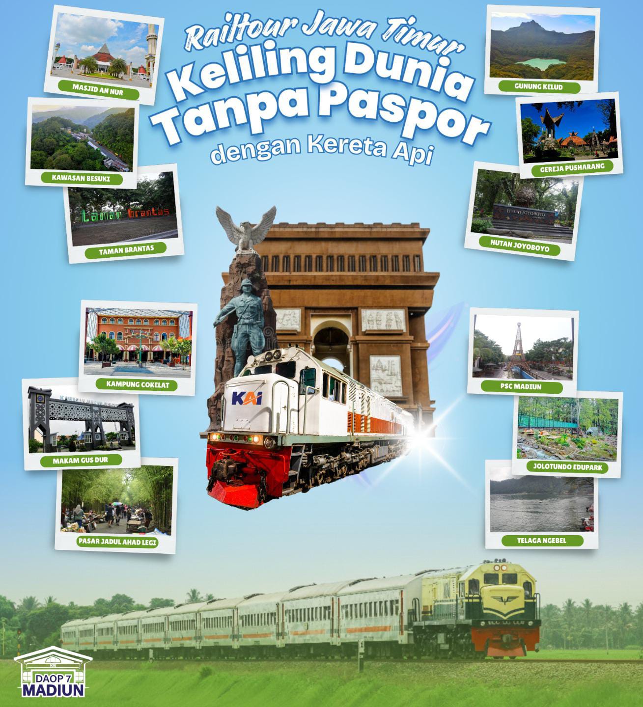 Rail Tour Jawa Timur menawarkan berbagai paket wisata menarik yang meliputi destinasi di wilayah KAI Daop 7 Madiun dan sekitarnya, di antaranya: