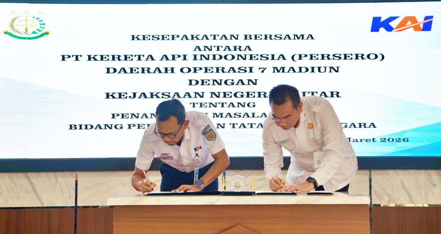 Blitar, JuKe.co.id – PT Kereta Api Indonesia (Persero) Daerah Operasi 7 Madiun melaksanakan penandatanganan Kesepakatan Bersama (MoU) dengan Kejaksaan Negeri Blitar tentang Penanganan Masalah Hukum di Bidang Perdata dan Tata Usaha Negara, bertempat di Kota Blitar, Rabu (4/3/2026).