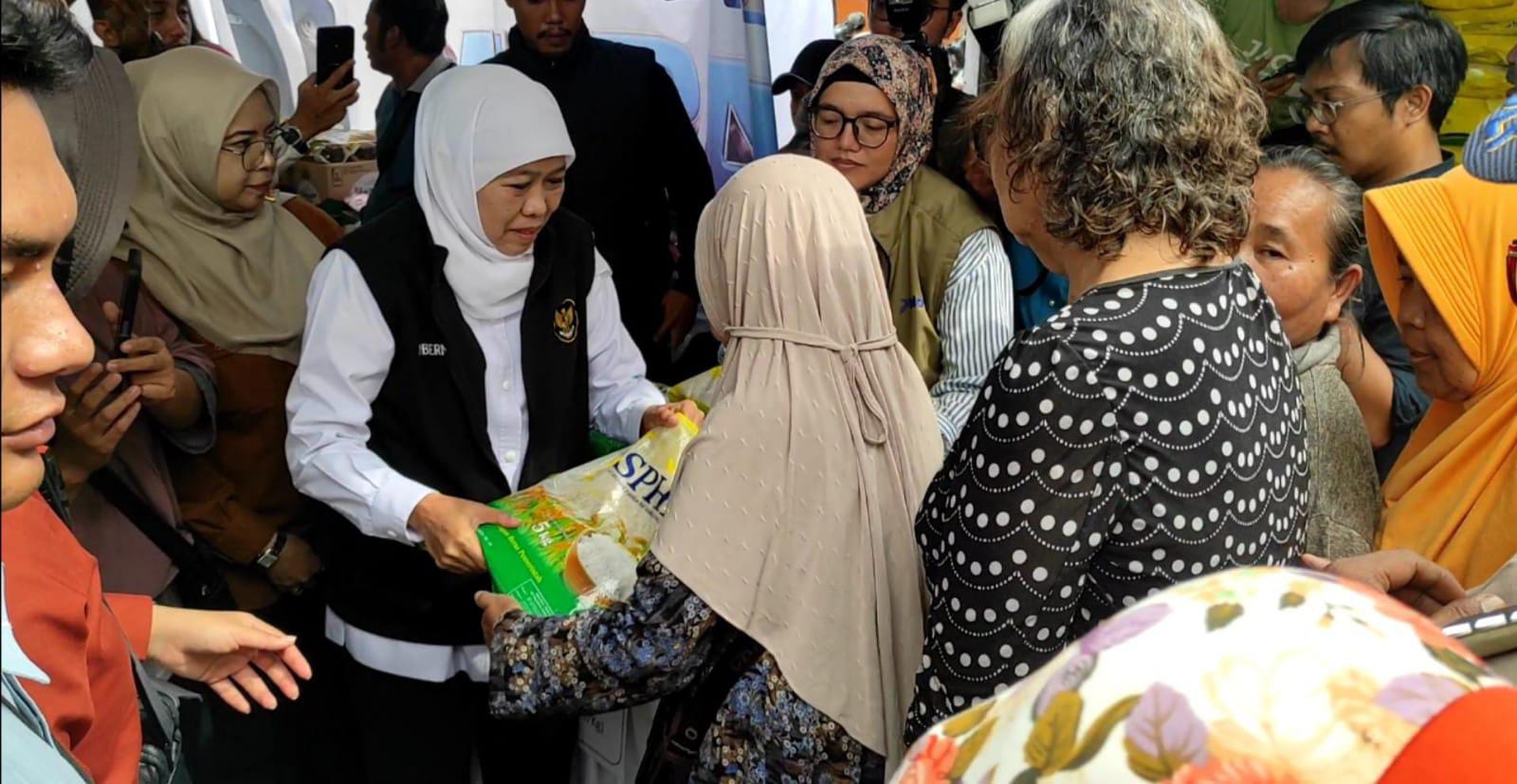 Dalam pasar murah tersebut, Gubernur Jawa Timur Khofifah Indar Para Wansa juga membagikan ratusan beras SPHP, telor dan produk UMKM Kediri, kepada warga yang mengantre.